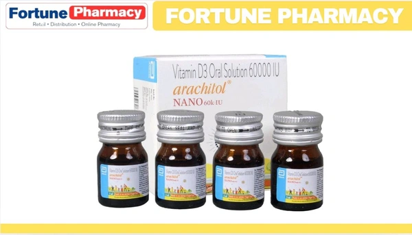Arachitol Nano Bottle Oral Solution (5ml each) is a dietary supplement with cholecalciferol, a fat-soluble vitamin D. It is particularly beneficial in managing bone health. Arachitol Nano syrup is used to manage calcium deficiency, helps strengthen the bones and supports bone, muscle and joint care.