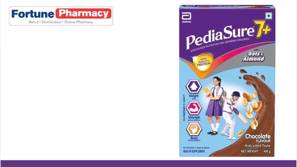 Pediasure 7+ is a specialized nutritional drink that provides complete, balanced nutrition for growing children 7 years & above. Scientifically designed with various vital nutrients along with the goodness of Oats and almonds to support height gain, strength improvement and brain development. with high-quality protein, Pediasure offers optimum nutrition to children 7 years and above to maximize growth & strength during the period of a second growth spurt. Bones can grow up to 1.5 times from 7 to 14 years. Pediasure 7+ is specifically formulated with essential nutrients like Zinc, Iron, Iodine, Protein, Calcium and Vitamin D to support this growth /height gain. Children engage in various day-to-day activities that require physical strength. Along with a healthy diet, Pediasure 7+ helps in meeting nutritional requirements in 7+ children. This nourishing health drink supports bone strength with key nutrients all known to improve bone mineral density and muscle mass. Pediasure 7+ also offers crucial nutrients like  Folic Acid, Vitamin B12 & Zinc iron, iodine to support brain development. Kids like the taste. This specialized nutritional drink available in chocolate and vanilla flavour.