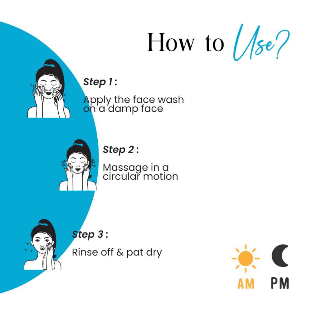 - Apply the Cleanser: Squeeze a small amount of our Face Wash onto your fingertips or palm. Gently apply the cleanser to your damp face, avoiding the eye area.