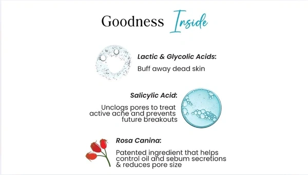 The formulation of Glycolic Acid, Salicylic Acid, Rosa Canina Extract, and Niacinamide together go deep into the skin, breaking the bond between acne-forming dead skin cells and slowly working to reduce its appearance on the skin.