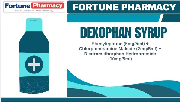 Dexophan Syrup is a combination of three medicines: Phenylephrine, Chlorpheniramine Maleate, and Dextromethorphan Hydrobromide. Phenylephrine is a decongestant which narrows the small blood vessels providing relief from congestion or stuffiness in the nose. Chlorpheniramine Maleate is an antiallergic which relieves allergy symptoms like runny nose, watery eyes and sneezing. Dextromethorphan Hydrobromide is a cough suppressant which relieves cough by reducing the activity of cough center in the brain.