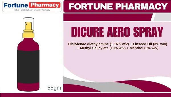 Dicure Aero Spray is a combination of four medicines: Diclofenac diethylamine, Linseed Oil, Methyl Salicylate and Menthol. Diclofenac diethylamine and Menthol are non-steroidal anti-inflammatory drugs (NSAIDs) which work by blocking the release of certain chemical messengers that cause pain and inflammation (redness and swelling). Linseed Oil is a plant-based oil which further reduces inflammation and improves blood circulation at the site of application. It also increases the penetration of Diclofenac diethylamine through the skin. Methyl Salicylate produces a cooling effect on the skin.