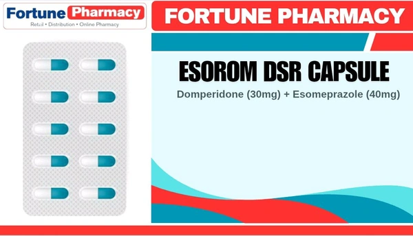 Esorom DSR Capsule is a combination of two medicines: Domperidone and Esomeprazole. Domperidone is a prokinetic that works on the upper digestive tract to increase the movement of the stomach and intestines, allowing the food to move more easily through the stomach. Esomeprazole is a proton pump inhibitor (PPI) that works by reducing the amount of acid in the stomach, which helps in the relief of acid-related indigestion and heartburn.