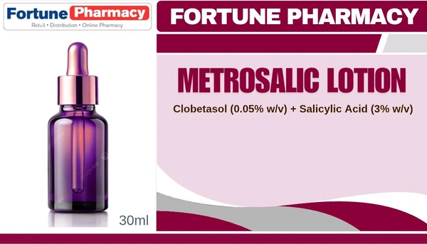 Metrosalic Lotion is a combination of two medicines: Clobetasol and Salicylic Acid, which treats eczema and psoriasis. Clobetasol is a steroid which blocks the production of certain chemical messengers (prostaglandins) that make the skin red, swollen and itchy. Salicylic Acid is a keratolytic medicine which breaks down keratin clumps, removes dead skin cells and softens the skin. It also enhances the absorption of Clobetasol into the skin.