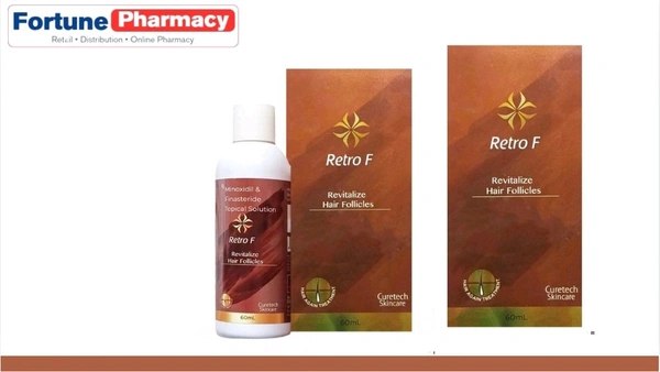 Retro F Solution is a medicine used to treat common hereditary hair loss in men. It prevents further hair loss and helps hair to regrow. It increases blood flow to the hair follicles on your scalp, which prevents hair cell death and also enhances new hair growth. It also stops production of a hormone that causes excessive hair fall or baldness and also increases hair growth. It is most effective for baldness or thinning at the top of the scalp but less effective at the front or for receding hairline. Benefits are less likely if you have been bald for many years or have a large area of hair loss.