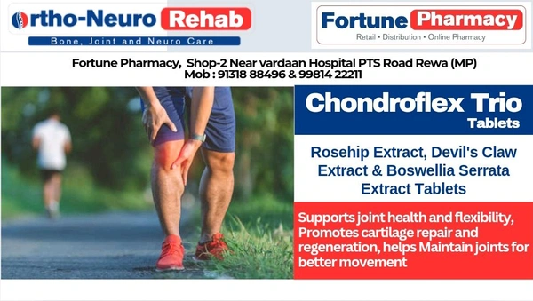 CHONDROFLEX TRIO is a premium joint support supplement formulated to enhance joint health, flexibility, and mobility. It combines the synergistic effects of three powerful natural extracts: Rosehip Extract, Devil's Claw Extract, and Boswellia Serrata Extract. These ingredients are traditionally known for their anti-inflammatory, analgesic, and antioxidant properties, which collectively help to reduce joint pain, swelling, stiffness, and improve overall musculoskeletal wellness. This formulation is designed to aid those experiencing joint discomfort due to arthritis, osteoarthritis, or other degenerative joint conditions, supporting healthy joint function and promoting greater ease of movement.